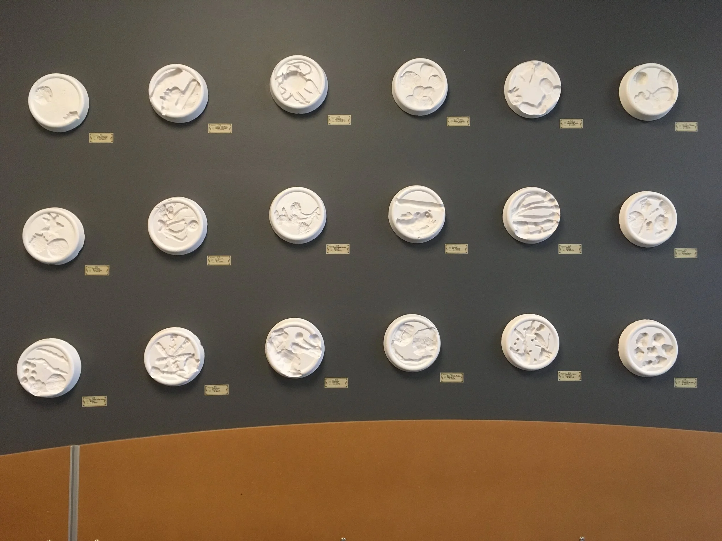 The SOAR fifth grade class of 2019 created this wall of plaster petrie dishes in collaboration with artist Nicole Banowetz. Nicole inspired the studentsby showing them microscopic imagery from nature. Together the students looked at bacteria, viruses, pollen, fungi, micro-animals and algae. They used this imagery to design their very own specimen. First they created drawings and information sheets about their unique microscopic combinations. The students then sculpted forms in clay and poured plaster over them to create their final artwork.