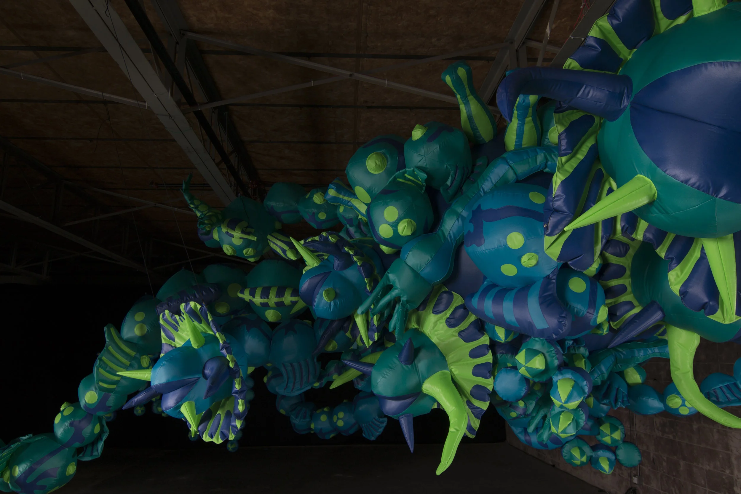 The sculpture begins as a mass of microscopic bits which grow into individual algae forms inspired by dinoflagellates. These phytoplankton fly across the space seeming to grow and replicate.